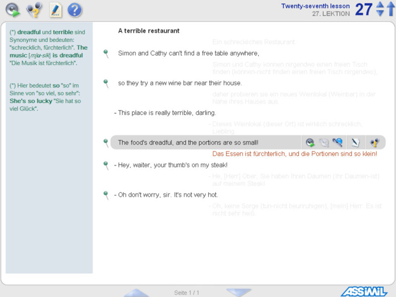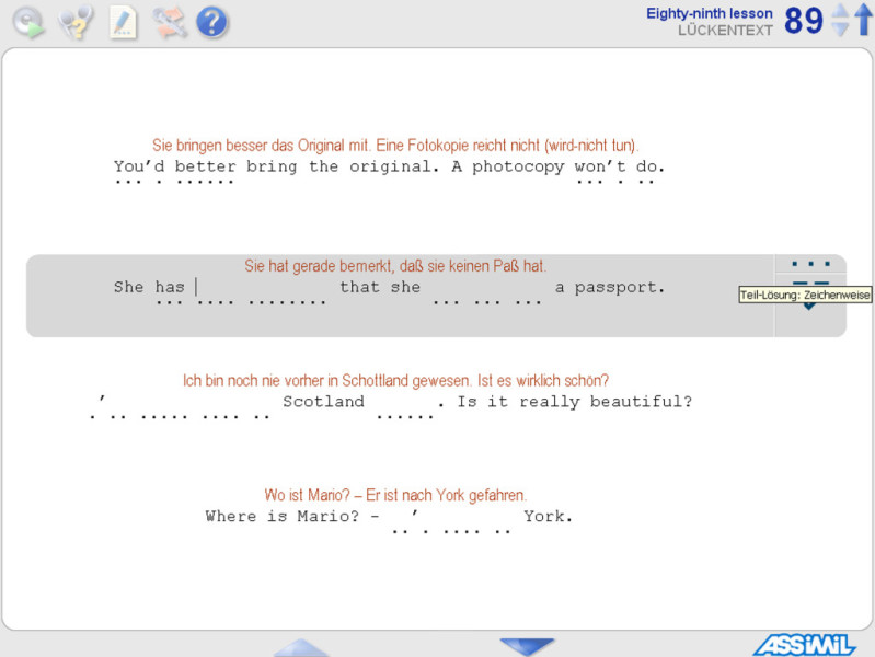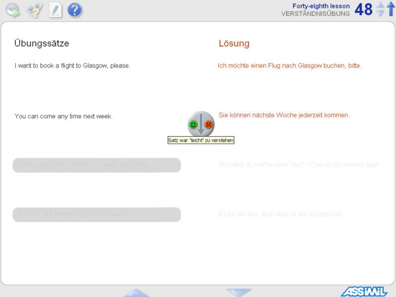 Wenn Sie in der Lage sind, die Lektionstexte zu verstehen und auch in den Übungen Wörter und Strukturen wiederzuerkennen, gehen Sie zur nächsten Lektion über. Am besten, Sie wiederholen eine Lektion in mehreren aufeinanderfolgenden Lernsitzungen.